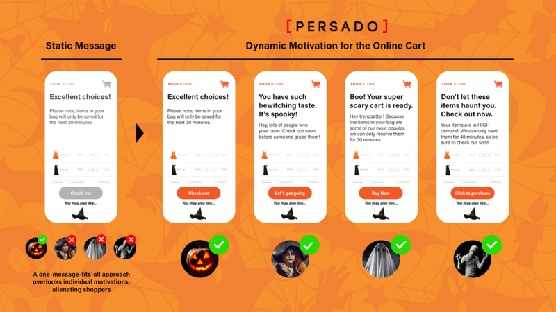 This image shows how Dynamic Motivation prevents online cart abandonment by serving personalized messages to various shoppers at the time of purchase using a festive Halloween theme.